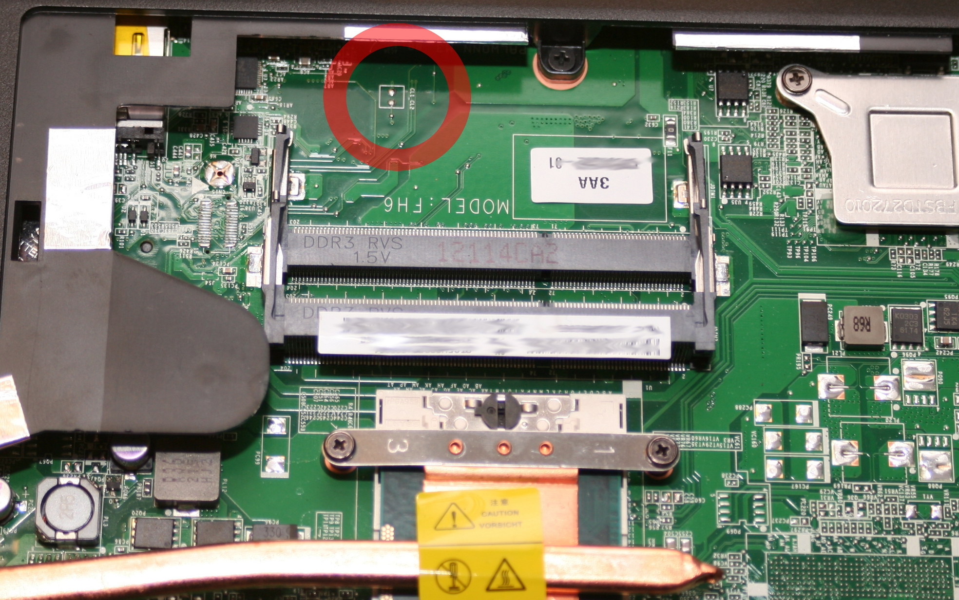 1-پشت لپتاپ رو باز کنید.بااحطیات رم رو از جای خوش در بیارید وقتی که رو از جاش در اوردید اون دوتا نقطه دیده میشه:
